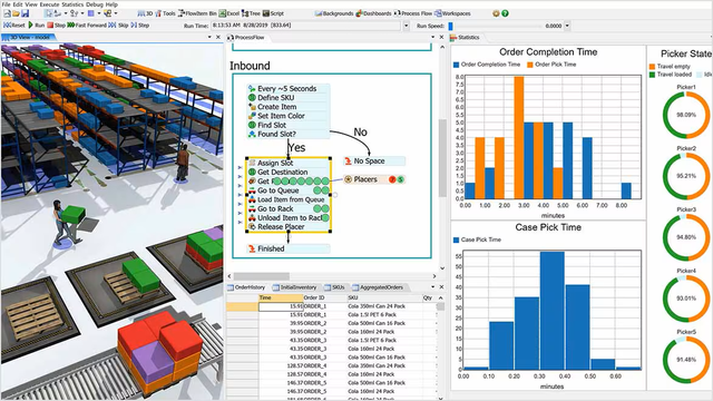 With easy drag-and-drop design, a complete library of objects with prebuilt logic, and a no-code logic creation environment, FlexSim can dramatically reduce the time it takes to create accurate simulation models.