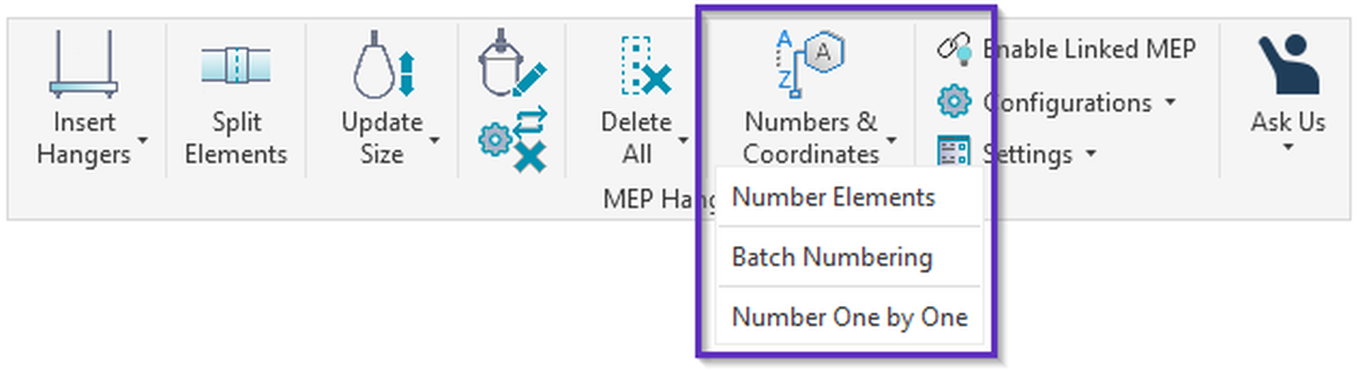 A Numbers & Coordinates közvetlen elérhetősége a MEP Hangers szalagban lehetővé teszi számunkra, hogy MEP-mérnökök számára testreszabott konfigurációs mintákat is biztosítsunk. Ezeket a Batch Numbering paranccsal érheti el.