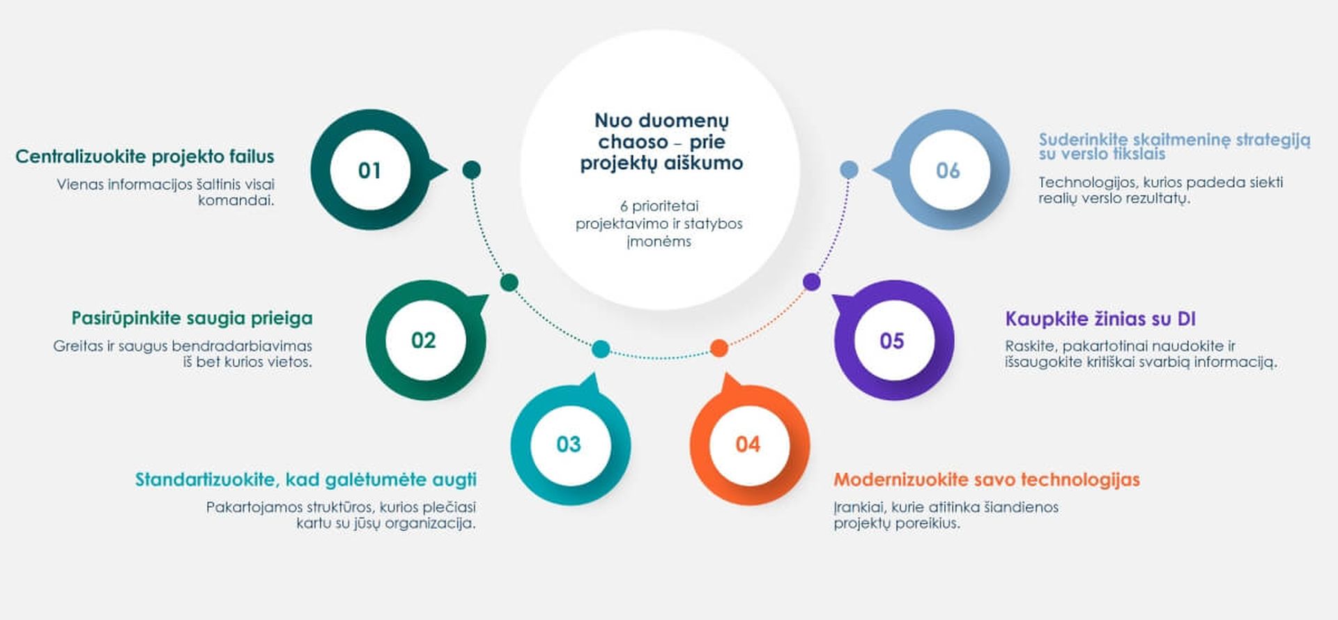Šiame straipsnyje pristatomi šeši pagrindiniai prioritetai, padedantys projektavimo ir statybos įmonėms pašalinti duomenų chaosą bei sukurti efektyvesnes, atsparesnes ir labiau tarpusavyje susietas veiklos aplinkas. Kiekvienas prioritetas – tai praktinis žingsnis link geresnio bendradarbiavimo ir sėkmingesnio projektų įgyvendinimo.