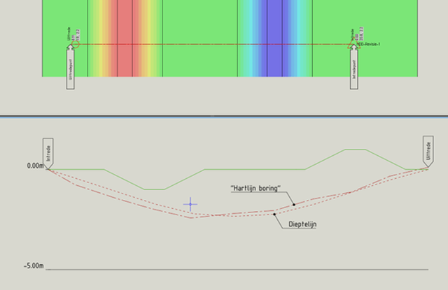 Deze lijn is vervolgens dynamisch gekoppeld aan het maaiveld. Wijzigt het maaiveld, zal deze lijn ook mee veranderen. Aan de hand van die dieptelijn kunnen dan aanpassingen aan de boorlijn worden gemaakt, waarna deze definitief gemaakt kan worden.
